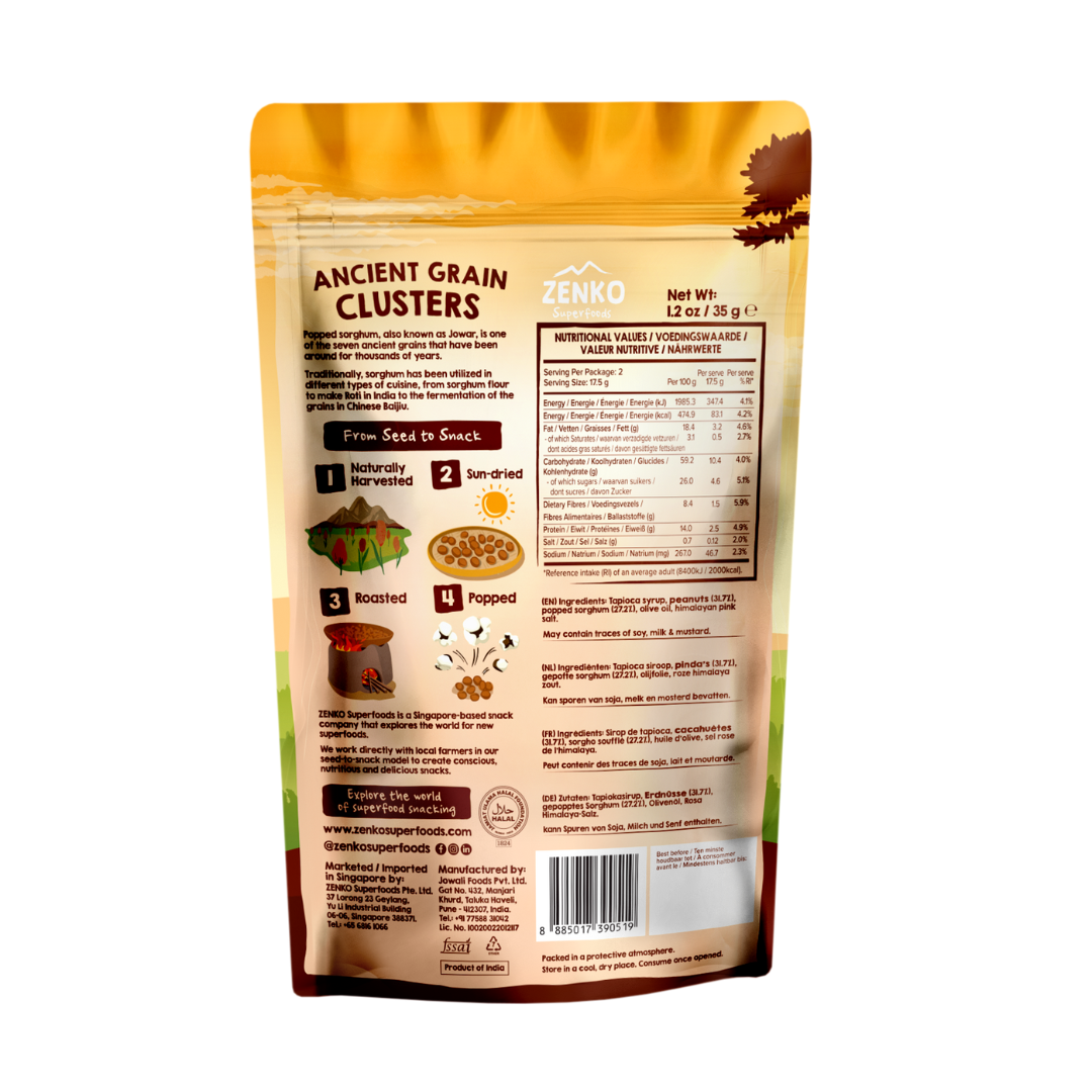 Light, crunchy clusters of popped sorghum blended with real peanuts for a rich, nutty flavor. A wholesome snack that fuels your day — perfect for breakfast, post-workout, or an afternoon boost.